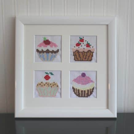 Cupcake sticken im Kreuzstich – mit diesen Stickdateieien für die Stickmaschine kannst du deine Küchenaccessoires wie Geschirrtücher oder Kochschürzen verzieren.